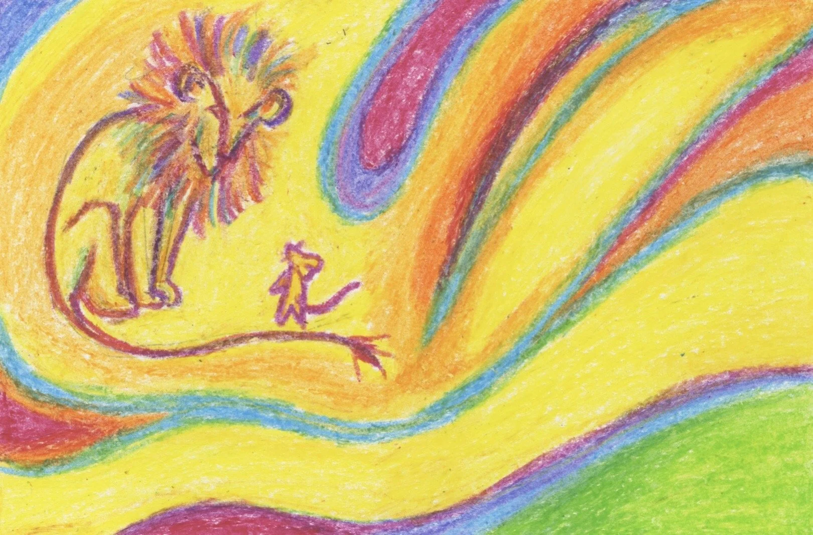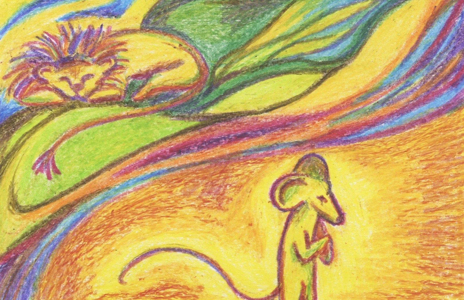 The Illustrations made for the fables story, the Lion and the Mouse has an emphasis towards colour theory & children’s illustration style, made with crayons on paper. I wanted t0 show simplicity but also bold and creative styles of play within illustration.